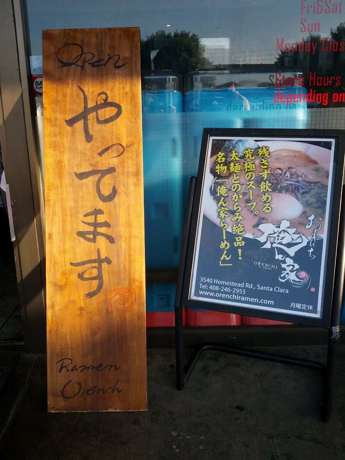 他座落在我們比較不熟悉的 Santa Clara,一個不起眼的 shopping square 裡。週日晚上整個空蕩蕩的 square 只有兩間店開門營業,金色的斜陽下顯得有些死寂,而 Orenchi 拉麵門口卻突兀地大排長龍,形成非常有趣的對比。我們抵達的時候約莫七點半,離打烊只剩一小時,門口的人龍仍然長得很。數了數 waiting list,我們前面還有將近 20 組人,看來是有得等了~